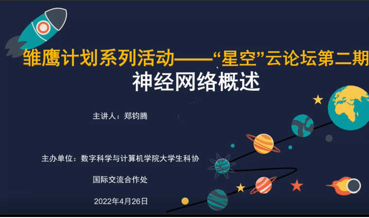 4月26日,由国际交流合作处支持,数据科学与计算机学院举办的“星空”云论坛第二期活动如期举行。论坛第二期邀请就读于加拿大滑铁卢大学计算机科学学院的博士生郑钧腾,以“神经网络概述”为主题,为大家做了精彩的线上讲座。数据科学与计算机学院近400名师生参加了本期活动。