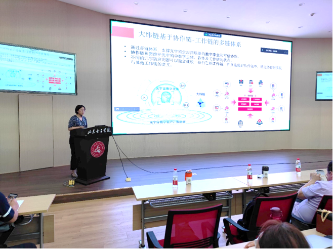 会上南京大学博士生导师郭延文教授、山东大学博士生导师孔兰菊教授、南京信息工程大学人工智能学院院长潘志庚教授分别以《三维场景重建- 从图形学研究到AI赋能》、《大纬链:面向元宇宙的区块链可信协作网络基础设施》、《宇宙与智慧医疗——医学元宇宙》为主题做了学术报告,介绍了各自研究领域的研究成果、研究进展和前沿技术,并与参会人员进行了热烈互动讨论。