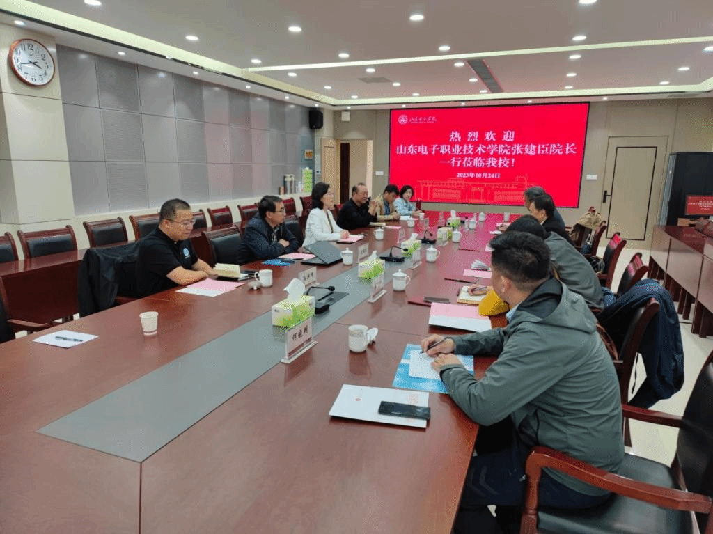 刘恩允校长首先介绍了学校的发展历程及近年来取得的办学成绩,表示非常欢迎山东电子职业技术学院一行来访,希望通过这次交流深化合作,推动双方在教育和科研方面的合作更上一层楼。张建臣院长也对学院成果进行了介绍,并表达了合作意愿,希望探讨双方在人才培养、教育创新等领域的合作机会,共同推动教育事业的发展。