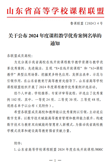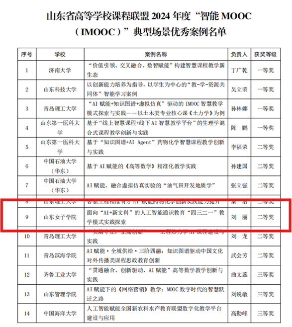 近日,山东省高等学校课程联盟公布了2024 年度课程教学优秀案例(鲁课联盟〔2024〕4 号)。由数据科学与计算机学院刘丽教师带领的《人工智能基础与应用》教师团队申报的《面向“AI+新文科”的人工智能通识教育“四三二一”教学模式实践探索》获评““智能 MOOC(IMOOC)”典型场景优秀案例”二等奖。