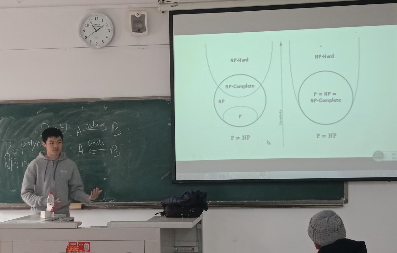 首先,张育晨同学用幽默有趣的语言向大家介绍了著名的NP完全问题(Non-deterministic Polynomial),即多项式复杂程度的非确定性问题。他在讲座中说到,有些计算问题是确定性的,比如加减乘除之类,你只要按照公式推导,按部就班一步步来,就可以得到结果。有些问题是无法按部就班直接地计算出来,这就是非确定性问题。而这些问题的通常有个算法,它不能直接告诉你答案是什么,但可以告诉你,某个可能的结果是正确的答案还是错误的。人们于是就猜想这类问题也许存在一个确定性算法,可以在多项式时间内直接算出或是搜寻出正确的答案,这就是著名的“NP=P?”的猜想。介绍完NP问题的概念后,他还讲了相关的搜索方法,比如近邻法,插入法,遗传算法等,同学们听得非常专注认真。之后,张育晨同学向我们介绍了他在加州大学所学课程、考试方式、国外老师的授课特点、国外学习氛围,他还分享了自己的学习方法,比如怎样做好一个project,怎样高效的学习等等。最后,他给大家推荐了很多宝贵的学习资源,如英文版免费算法教材,国内能看到的伯克利教授免费课堂视频教程等,并热情回答了同学们对于当前计算机专业热点话题人工智能等问题的提问。
