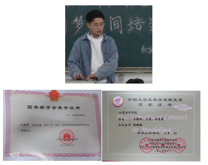 王振东,2019级软件工程专业学生,中共预备党员,现担任班级班长、曾任1024协会学生社团会长、ACM集训队19级队长。为人诚恳正直,乐于助人,总是尽自己最大的努力去帮助每一位同学,勇于承担起自己的责任。曾获得国家奖学金1次,一等奖学金4次,三等奖学金1次,积极参加各项大赛,获“蓝桥杯”全国总决赛二等奖1次、“蓝桥杯”全国总决赛三等奖1次、“数学建模”省级三等奖、“ACM-ICPC”山东赛区铜奖2次,并多次获得“学习标兵”、“优秀团干部”、“优秀学生干部”等称号。在校期间,积极参与志愿者服务,认真做好班长的职责,及时向老师反映问题,多次组织班级活动,增强班级凝聚力。