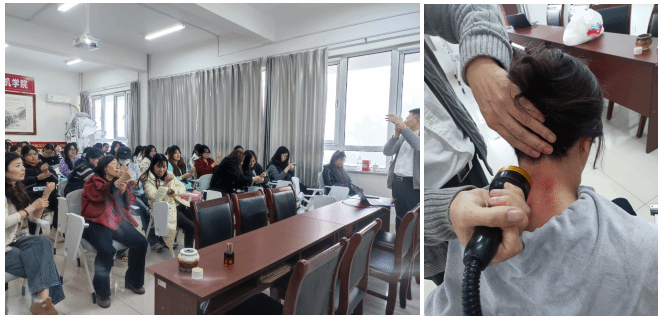 讲座围绕中医养生理念,结合日常手部护理实际,设置了知识科普、实操教学、互动答疑与体验交流四个环节。丁力老师从中医基础理论入手,讲解了手部护理的重要性、日常保养要点及常见手部问题的成因与应对方法。在实操环节中,他详细示范了重点穴位的定位技巧、正确按压手法及力度控制要点,帮助参与者掌握科学有效的保健技巧。在互动答疑环节,教职工们积极提问,针对手部酸痛、僵硬、干燥等常见问题进行深入交流。活动最后还安排了现场体验空气拔罐,老师们积极报名,对体验感给出高度评价。