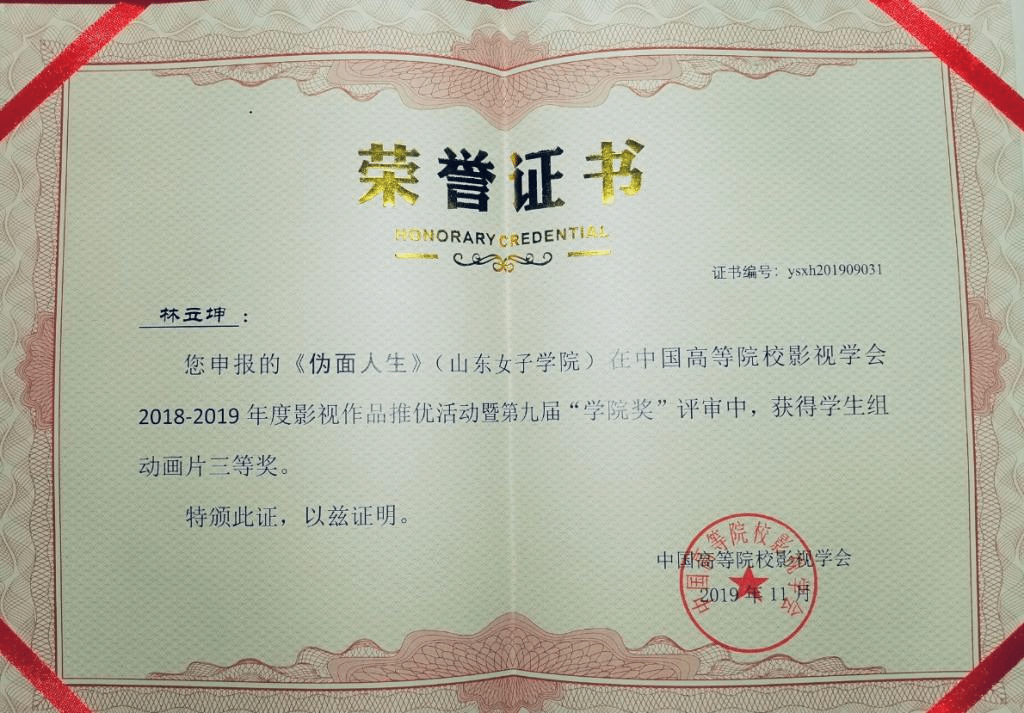 2019年11月1日-3日,中国高等院校影视学会第十九届年会暨第十二届中国影视高层论坛于山东师范大学召开,来自北京师范大学、中国传媒大学等全国近200所高校的500多位专家学者参会。期间举行了第九届“学院奖”颁奖仪式,我院数据科学与计算机学院数字媒体技术专业林立坤、廖若晨同学创作的《伪面人生》获“学院奖”三等奖。