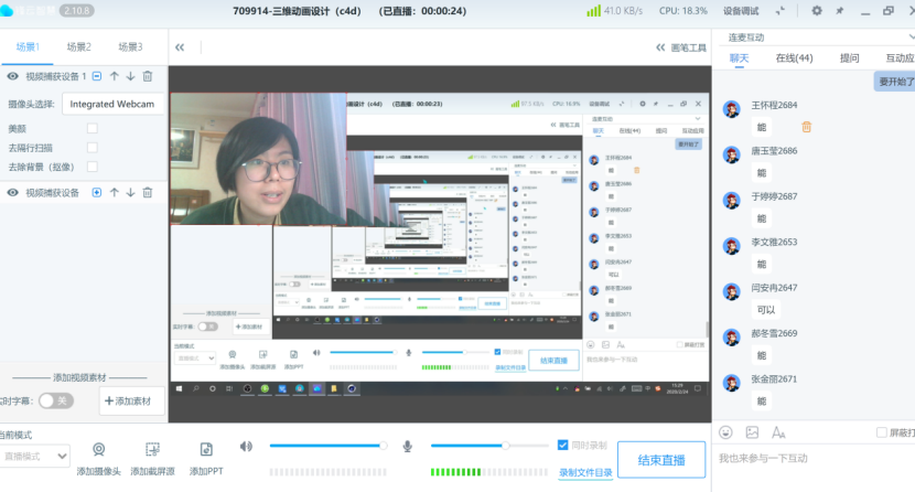 授课老师和同学们都在电脑前,相互之间可以看到对方的面容、听到对方声音,老师认真授课,同学们也积极参与互动。因为疫情不得不相隔千里的远程教学,在这里仿佛消弭了距离,大家的热情和动力溢于言表,让线上课堂热闹又生动。快来看看第一次当主播的各位网红是什么感脚吧。