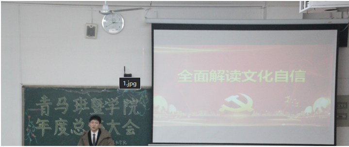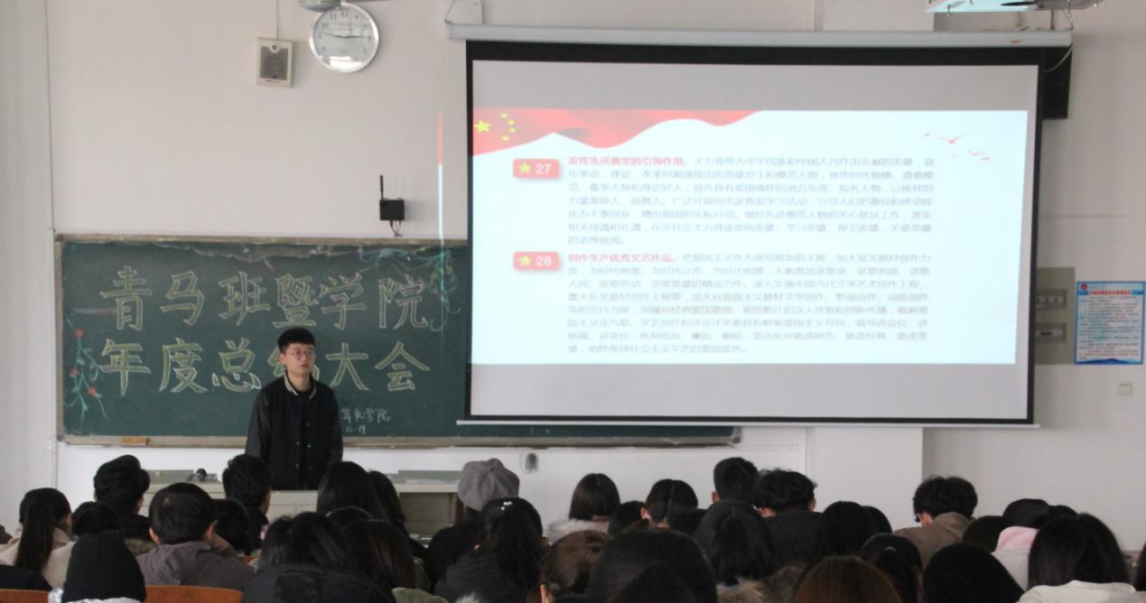 此次会议共分为三部分,首先由学生代表淡了学习体会,宋志诚同学回顾在青马班培训经历,讲述了在青马班的收获,并表示身为青马班一员,要争当先锋模范,传承红色基因,乐于奉献社会,做一名合格的青年马克思主义拥护者和接班人;学生会主席杨鑫超同学讲述文化自信和平“语”近人,用自身经历为同学们讲述文化自信的重要性及其必要性,同学们更加深刻的了解到一个优秀的民族,必须坚定其文化自信。随后,郑全蕾书记对青马班的学习效果和学生会一学期的辛勤工作给予了充分肯定,对于同学们反应的工作与学习无法兼为的情况,提出良好的学习方法才是解决问题的关键。在解答完同学们的问题后,对学院的学团一年来的工作进行总结,并对下学期的学生会工作作出要求。最后,团总支孙利华老师对团体同学提出了具体要求,希望大家肩负起时代重任,志存高远,脚踏实地,努力在实现中华民族伟大复兴的中国梦的生动实践中放飞青春梦想,希望大家平时加强理论学习,加深对马克思主义和习近平新时代中国特色社会主义思想的理解。