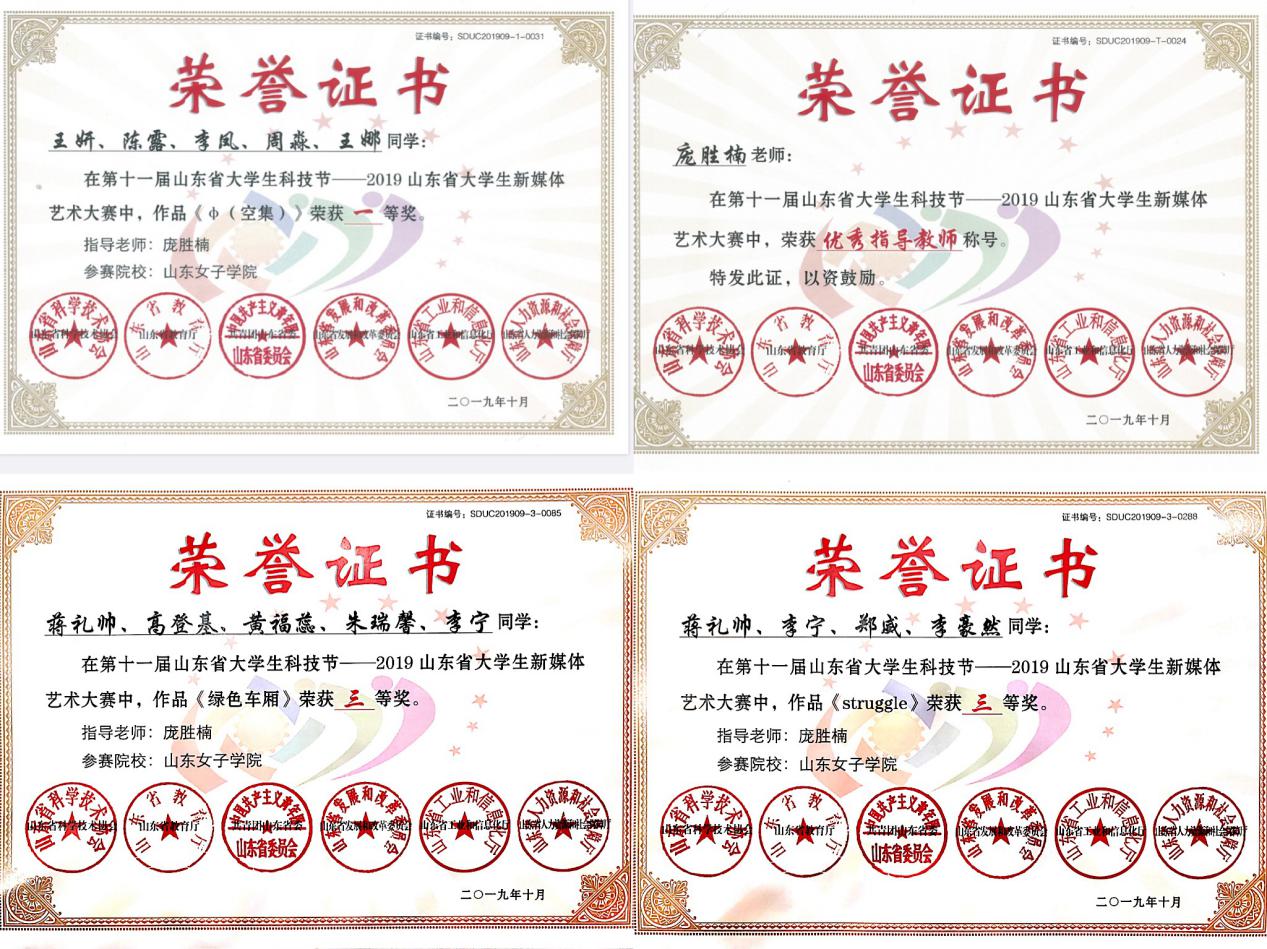 近日,我院师生在2019山东省大学生新媒体艺术大赛中获得一等奖1项,三等奖2项,优秀指导教师奖1项。其中2016级学生王妍、陈露、李凤、周淼、王娜创作的《空集》获得一等奖,蒋礼帅、高登基、 黄福蕊、朱瑞馨、李豪然等同学的作品《绿色车厢》、《struggle》获得三等奖,数字媒体专业教师庞胜楠获得优秀指导教师称号。