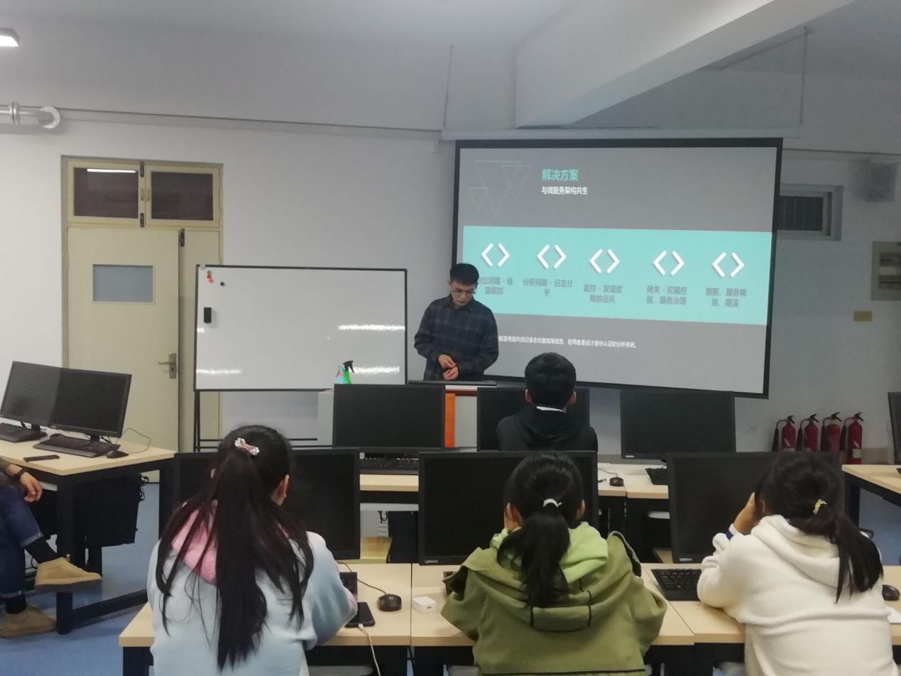 第一次活动由18级软件工程的步赟涵同学为大家讲解前后端分离开发和微服务构架,微服务是指将大的项目分割为小的服务,与之相对应的是中台架构,讲解结束后,步赟涵同学又给大家分享了身份认证系统,非对称加密算法。分享结束邵老师进行分析、补充,所有成员一起进行讨论。