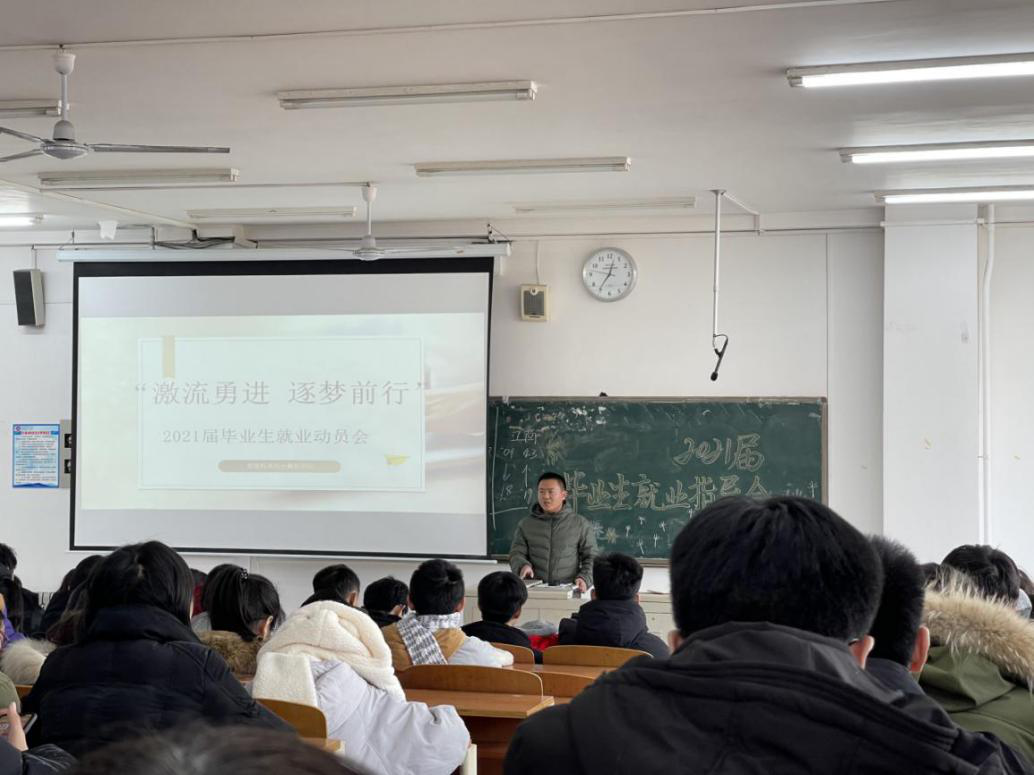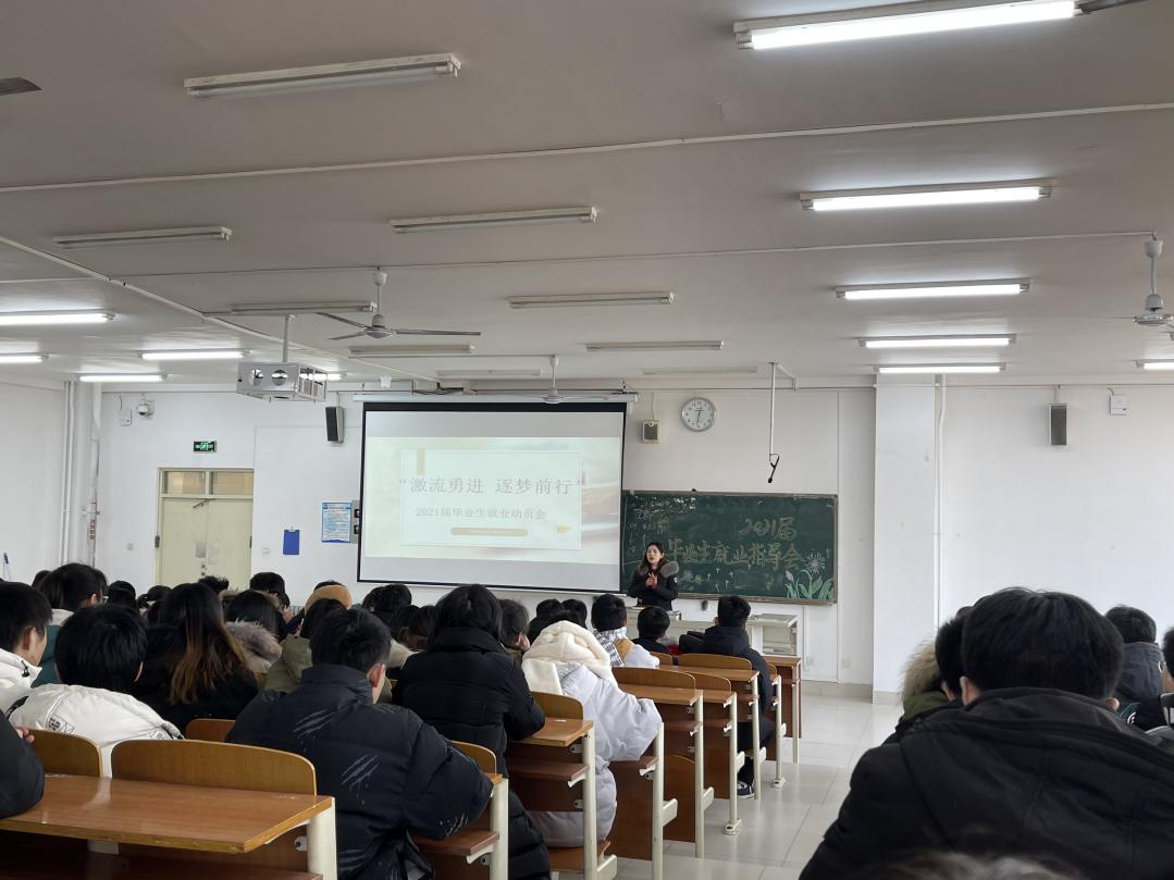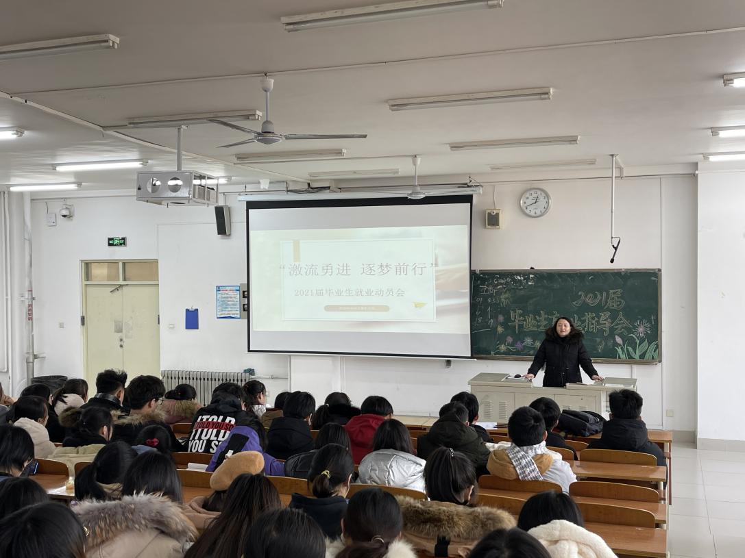 1月5日下午,我院在博文楼210成功举行“激流勇进 逐梦前行”2021届毕业生就业动员会。学院党总支副书记郑全蕾、辅导员魏宝懿、郭晓东、赵敏、王子露老师以及2021届全体在校毕业生参加此次就业动员会。此次会议由魏宝懿老师主持。