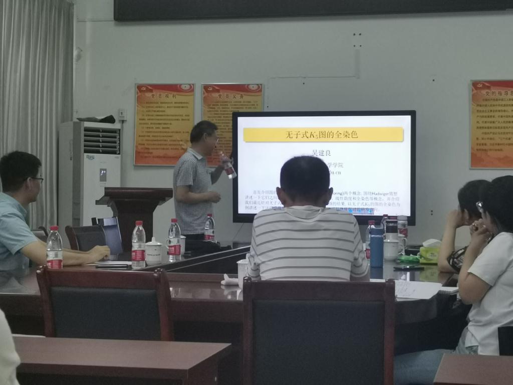 本次报告的主题是《无子式K5图的全染色》,首先介绍图的子式(minor)和点染色(vertex coloring)两个概念,围绕Hadwiger猜想讲述一下它们之间的联系;其次给出图的边染色、线性荫度和全染色等概念,并介绍我们最近针对无子式K5的图在这些染色方面获得的结果,以无子式K5图的全染色为例讲述一下这些结果的证明思路;最后提出一些可以继续探讨的研究方向。报告会后,吴建良教授和在场师生们进行了交流与互动,并对大家提出的问题一一进行了解答,本次报告让在场师生们受益匪浅。