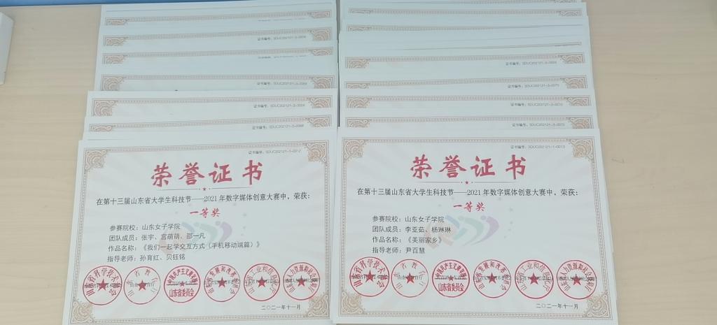 近日,第十三届山东省大学生科技节——“超感杯”山东省大学生数字媒体创意大赛决赛顺利举行,学院共有69支队伍参加了本次比赛,2017级数字媒体技术(虚拟现实方向)的胡宇涵、2019级数字媒体技术的李亚茹、杨琳琳、2019级数字媒体技术(校企合作)的张宇、宫萌萌、邵一凡等同学取得了一等奖3项、二等奖5项,三等奖17项、优秀奖44项的优异成绩。指导教师孙育红、庞胜楠等10名老师分别获得优秀指导教师奖,山东女子学院获得优秀组织奖称号。