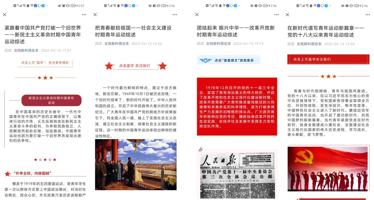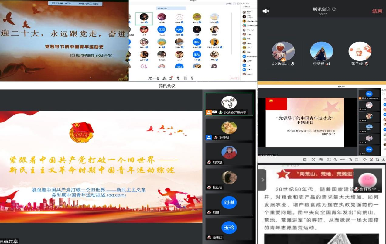 4月10日至16日,数据科学与计算机学院利用团总支微信公众账号推送新民主主义革命时期、社会主义建设时期、改革开放新时期以及党的十八大以来的中国青年运动史综述,为主题团日的召开提供理论学习材料;4月15日以来,学院各团支部积极开展线上主题团日,深入了解中国共产党领导下青年运动发展历程和重大事件,了解中国共产党领导广大青年在革命、建设、改革不同历史时期接续奋斗、建功立业的不朽事迹,让同学们进一步理解青年对国家发展的重要性,激励青年学子树立起“敢于有梦、勇于追梦、勤于圆梦”的人生追求。