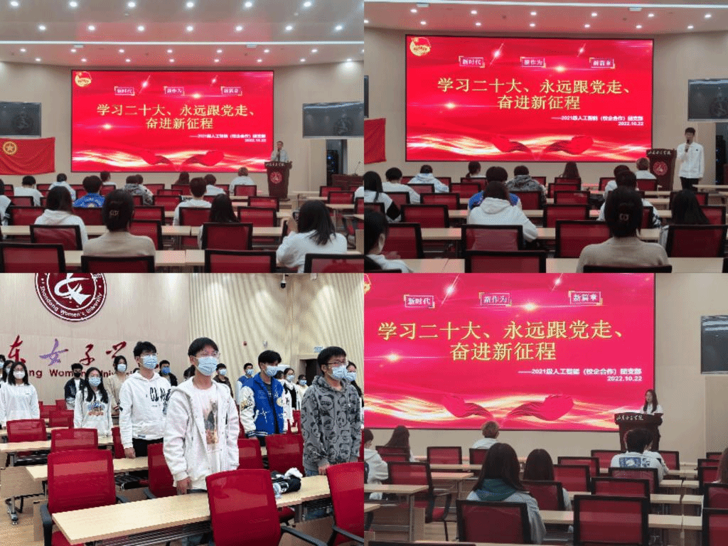 为庆祝党的二十大胜利召开,进一步增强团员政治意识、组织意识和模范意识,展现新时代团员青年的青春风貌,深入滋养爱党爱国初心、赓续红色血脉,数据科学与计算机学院于2022年10月22日18:00在求真楼报告厅举办“学习二十大、永远跟党走、奋进新征程”示范主题团日。2021级人工智能(校企合作)团支部作为开展主体,完整、标准的展示主题团日流程,2022级各团支部书记、学院学生会骨干列席参加。