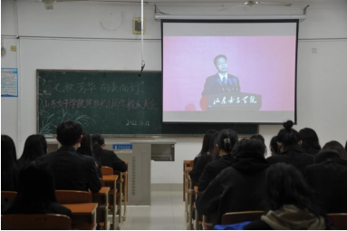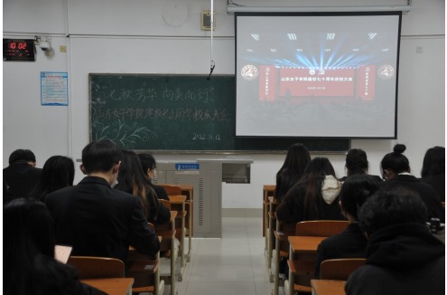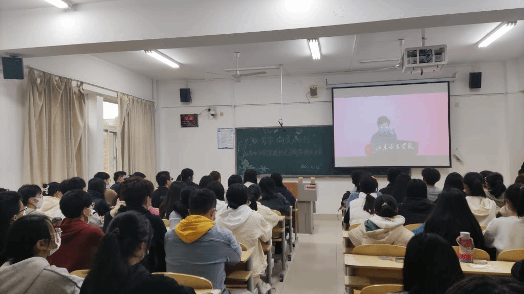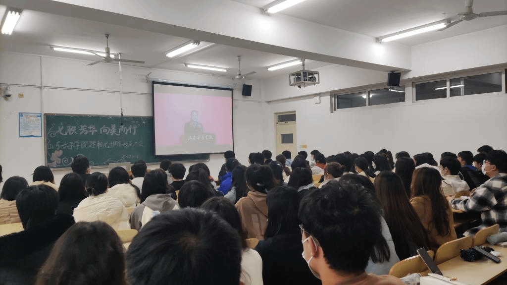 “砥砺奋进七十载,同心筑梦新时代”。11月12日,山东女子学院迎来了建校七十周年华诞,上午10点校庆大会总会场在图书馆第二报告厅召开。为进一步凝聚数科学子的思想共识、激发数科学子的奋进力量,数据科学与计算机学院组织广大学生于分会场进行线上观看,其中学生骨干统一着正装于博学楼319,2022级四个新生代表班于博学楼315和博学楼317,其余同学们以宿舍为单位于线上观看,全体同学统一佩戴七十周年校庆特制版校徽及特定版口罩共同见证了此次校庆大会直播。