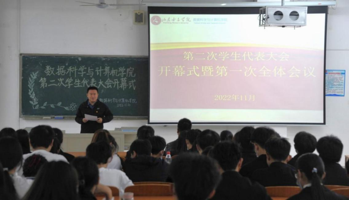 11月10日下午,山东女子学院数据科学与计算机学院第二次学生代表大会在博文楼208隆重开幕,137名正式代表和辅导员老师代表参加了此次大会,学院党委副书记白琨、团总支书记郭晓东参加了开幕式并致辞。