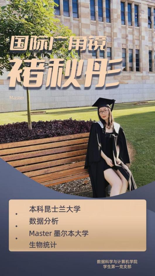 为拓宽学生党员的国际视野,探究更高层次学习的广度、难度、深度,同时了解国外硕士研究生学习、生活的节奏,4月26日,数据科学与计算机学院三个学生党支部线上邀请来自墨尔本大学生物统计专业硕士在读的褚秋彤学姐给大家分享专业知识和硕士生活相关内容。