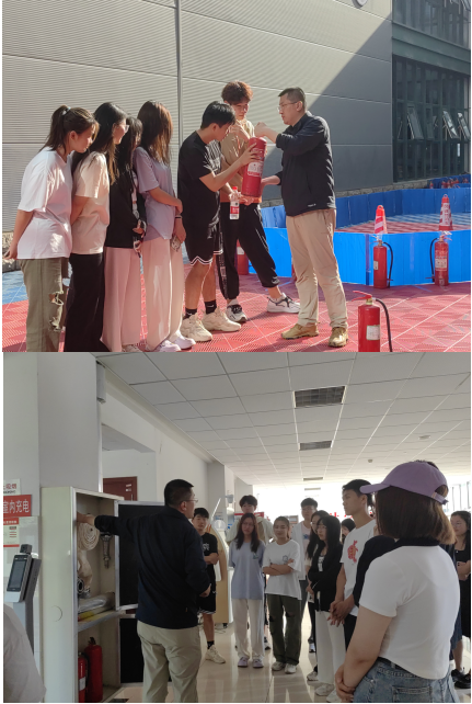 活动中,负责学生安全教育的辅导员老师以校园中的真实火险案例为切入,介绍了火灾起因、分类、发展阶段等基本知识,结合现场实物,重点讲解了室内消火栓箱、手提式干粉灭火器、消防水龙带、消防软管卷盘、手动火灾报警按钮等常见消防设施设备器材的使用方法,并现场进行了演示与互动。