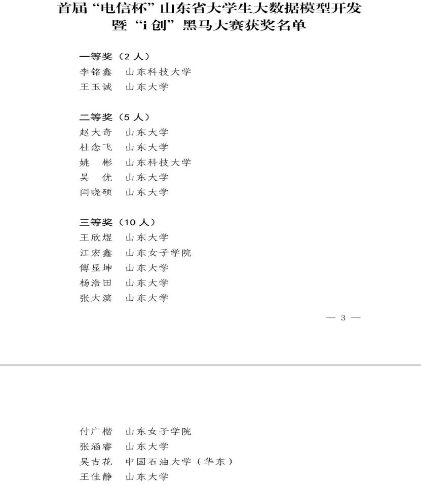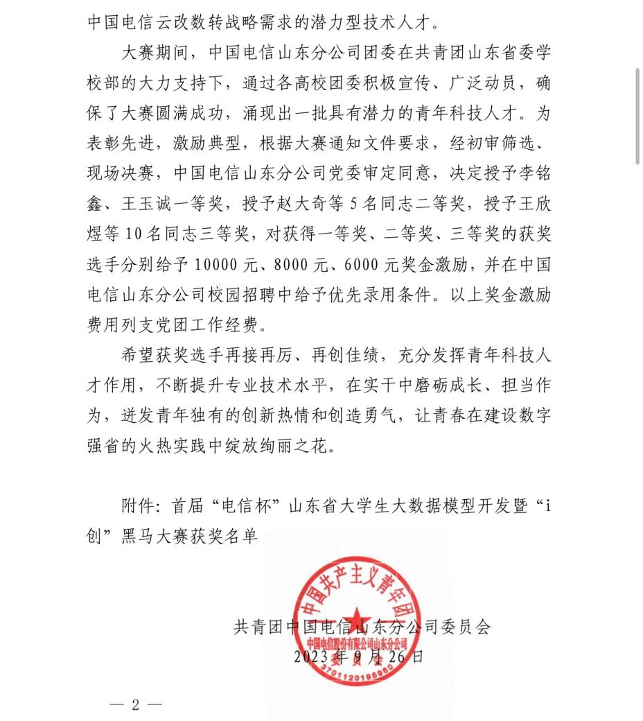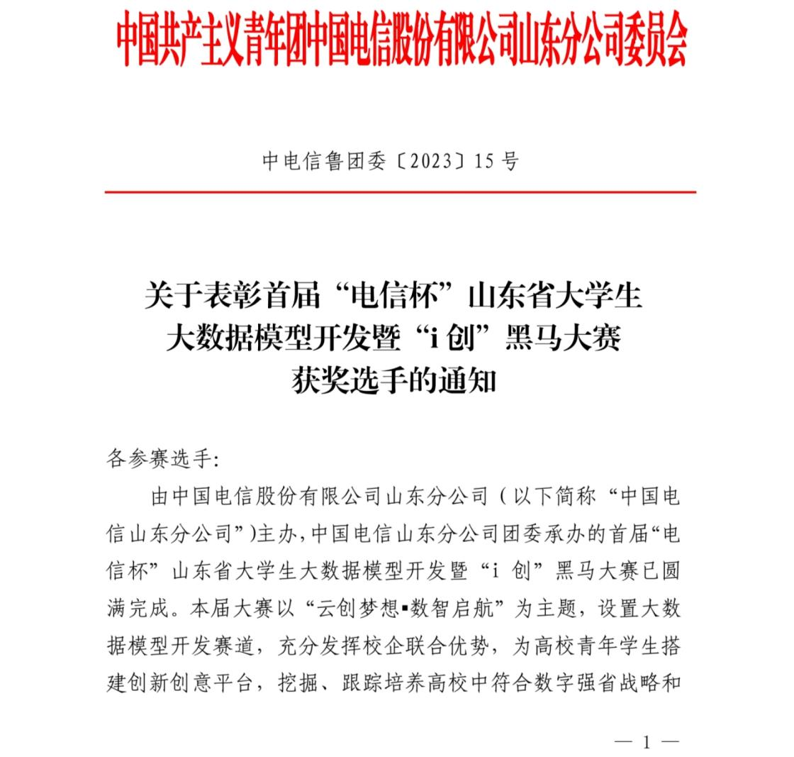 近日,首届“电信杯”山东省大学生大数据模型开发暨“i创”黑马大赛决赛结果揭晓。数据科学与计算机学院人工智能(校企合作)专业的江宏鑫、付广楷同学从众多参赛选手中脱颖而出,荣获三等奖,得到6000元奖金,并获得中国电信山东分公司校园招聘优先录用条件。