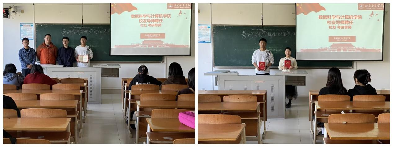 随后,数科院向两位校友颁发了校友考研导师聘书,并将校友与在校生进行考研结对。在未来考研的过程中,校友们将会给结对的同学进行一对一指导,全程助力学弟学妹的研究生考试。毕业的校友们对考研细心的讲解和对同学们的鼓励,使同学们更加坚定了学习的信心。