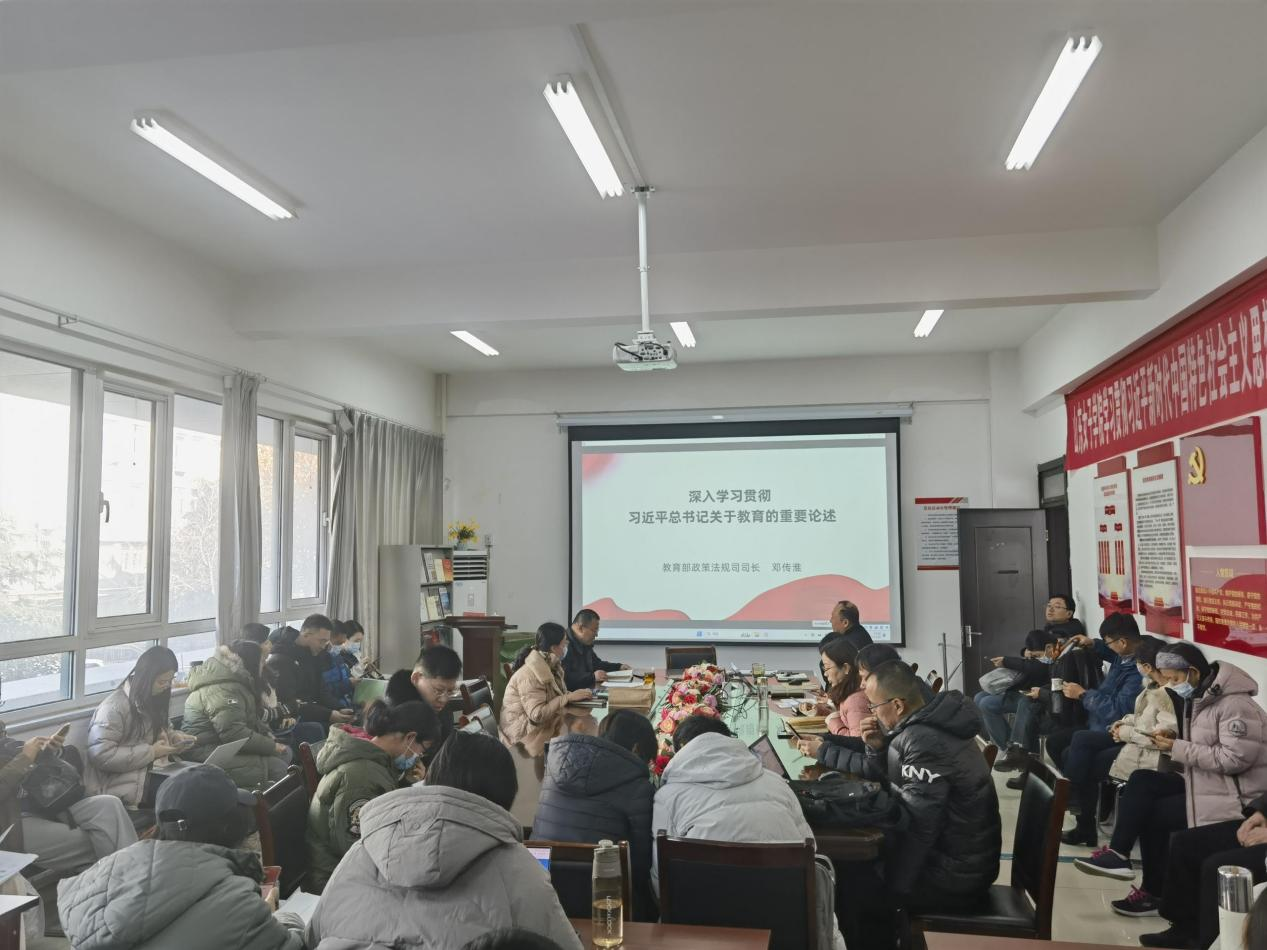本次会议组织大家集体观看了由教育部政策法规司司长邓传淮的解读视频《深入学习贯彻习近平总书记关于教育的重要论述》。邓传淮从“十个首次”、“九个坚持”、“五育并举”、“四个加快建成”,深入系统地解读和阐释了习近平总书记关于教育的重要论述,报告深入浅出,旁征博引,既有理论的高度、思想的深度,又联系实际、生动透彻,深刻阐明了党的二十大报告首次把教育、科技、人才进行“三位一体”统筹安排、一体部署,极具战略意义和深远影响。
