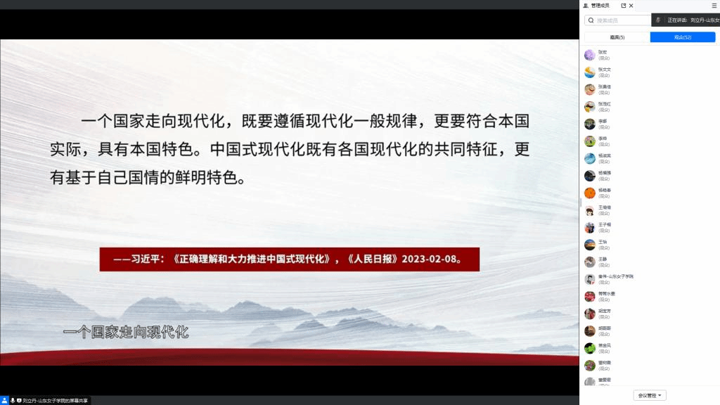 会上组织学习了中国浦东干部学院董德兵教授的视频《正确理解中国式现代化的科学内涵》。党的二十大报告明确概括了中国式现代化五个方面的中国特色,即中国式现代化是人口规模巨大的现代化,是全体人民共同富裕的现代化,是物质文明和精神文明相协调的现代化,是人与自然和谐共生的现代化,是走和平发展道路的现代化,深刻揭示了中国式现代化的科学内涵,科学回答了建设什么样的社会主义现代化强国以及怎样建设社会主义现代化强国等重大问题,为全面建设社会主义现代化国家指明了正确方向。