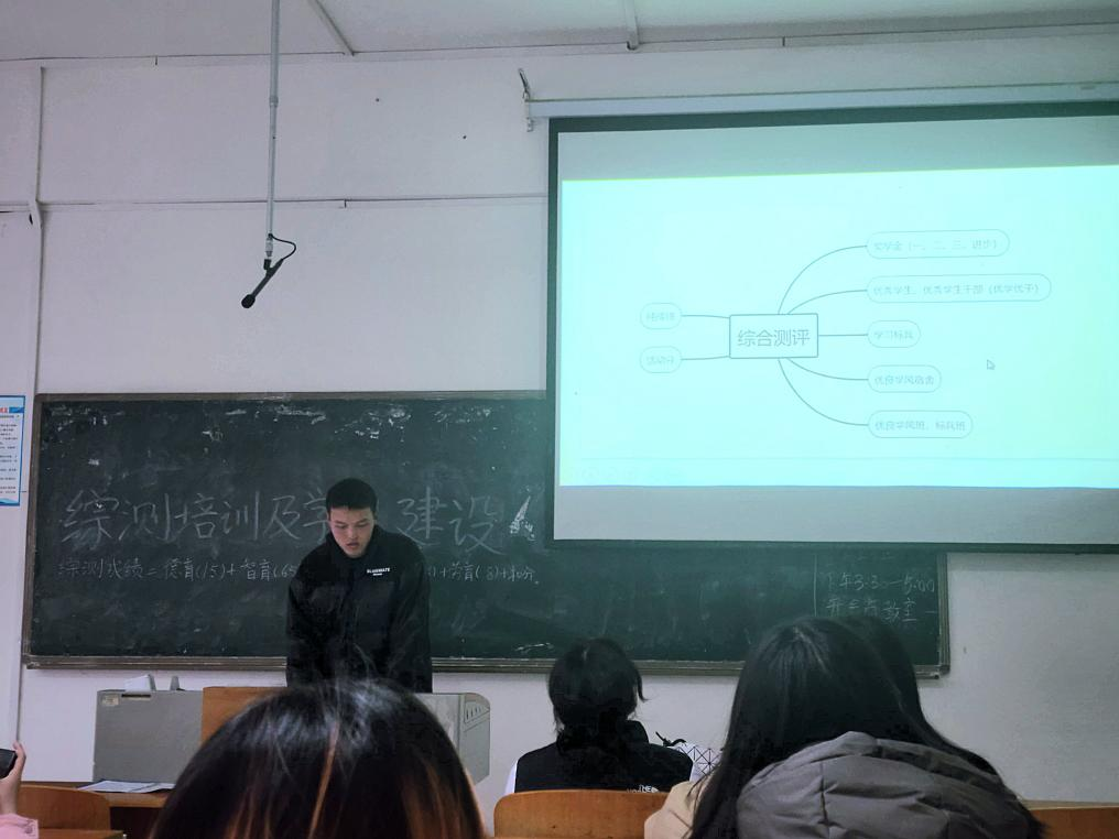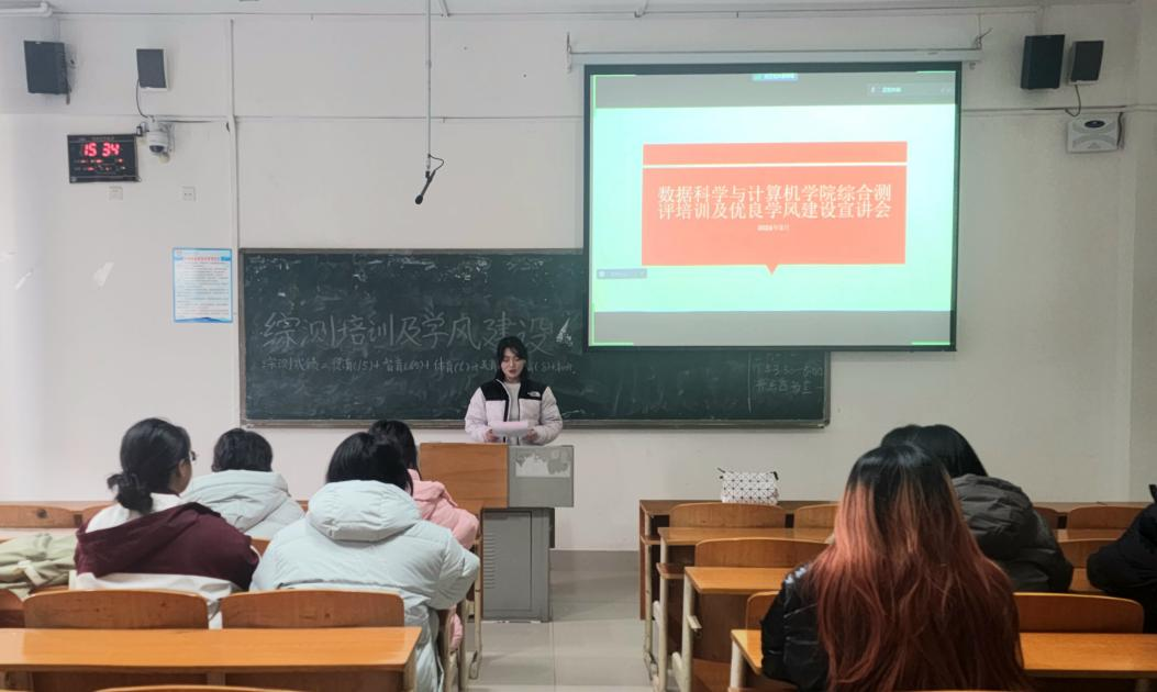 为进一步深化班风学风建设,切实做好数据科学与计算机学院新学期综合素质测评工作,针对学院综合测评文件充分学习调研,保证文件顺利的实施,营造良好的育人氛围,提高学生学习积极性,引导学生全面发展,数据科学与计算机学院于2月29日下午,在博学楼105召开了2023级综合测评文件学习培训暨新学期学风建设宣讲会,本次会议由辅导员韩新虹主持召开,数据科学与计算机学院学生会学习部成员及2023级部分班委参会。