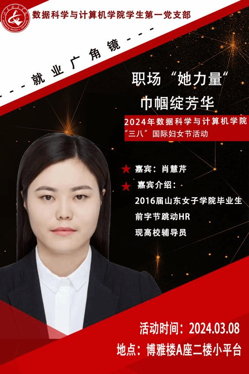 在第114个“三八”国际妇女节来临之际,3月8日上午,数据科学与计算机学院分工会在博雅楼名师工坊举办“职场‘她力量’,巾帼绽芳华”活动,邀请优秀校友肖慧芹返校,从职场女性视角出发,围绕高校毕业生求职就业中的重点问题,通过茶话会的形式,与学子分享交流。