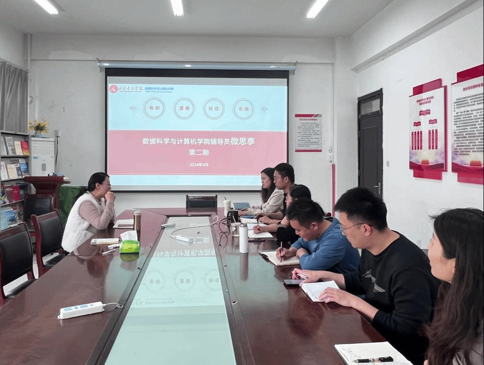 为切实加强我院辅导员队伍专业化、职业化建设,充分了解辅导员工作实际和发展需求,不断提升辅导员队伍的凝聚力和战斗力,4月1日,数据科学与计算机学院在博雅楼A201会议室召开第二期辅导员“微思享”研讨交流会。学院全体辅导员老师参加会议。