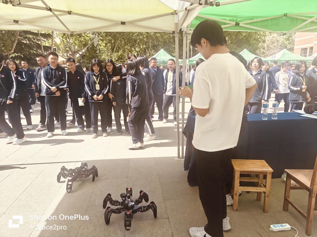 活动开始,团员青年向青少年学生展示六角蜘蛛机器人和竞速车,通过手机操控,蜘蛛机器人可以完成旋转以及爬行的动作指令,竞速车可以通过电脑算法编辑,在预设轨道上行驶,同时还可以躲避障碍物。该项目曾代表数据科学与计算机学院在第二十五届中国机器人及人工智能大赛全国总决赛中斩获一等奖。团员青年认真向学生们讲解内部原理以及操作步骤,现场学生热情互动,亲身体验,激发青少年的动手能力与热爱科学的兴趣,点燃青少年“科技强国梦”。