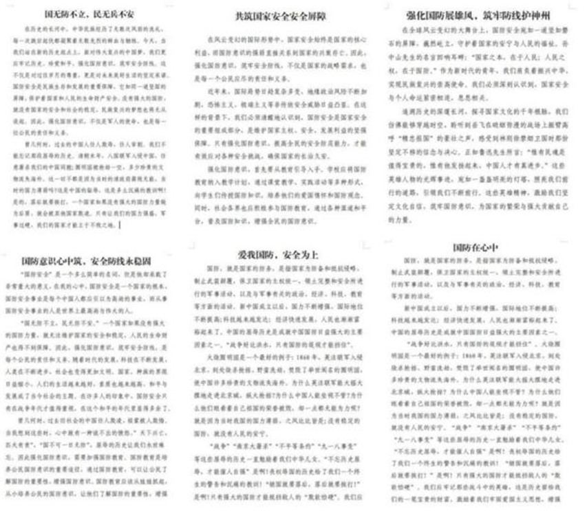 征文以国防教育为主旨,主题围绕国家强大、民族昌盛、人民安宁、家庭幸福等多个角度进行撰写,同学们用文字表达了自己对国防的理解与感悟,抒发了对国家安全的关注与思考,展示了当代大学生对于国家安全的责任与担当。抒发了对和平生活的珍视和青年一代对国防事业使命感和责任感。