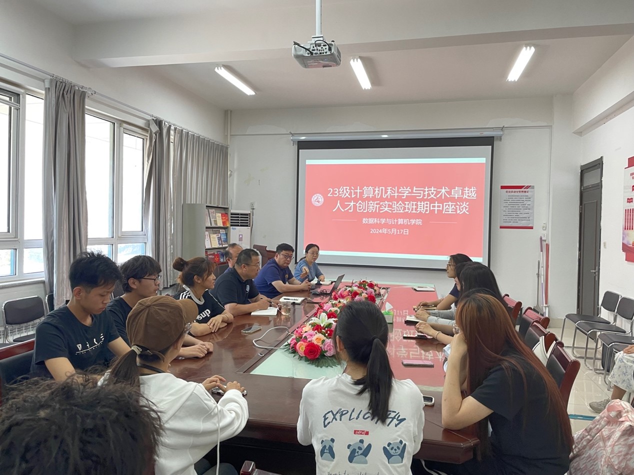 5月17日,数据科学与计算机学院在博雅楼A201组织2023级计算机科学与技术卓越人才创新实验班中期座谈会,学院党委书记潘建勋、院长孙洪峰、副院长季振东、教研室主任刘丽以及创新实验班辅导员王子露老师参加了此次座谈会。老师们与同学们就大学四年的规划、学科竞赛等方面进行了深入的交流和指导。