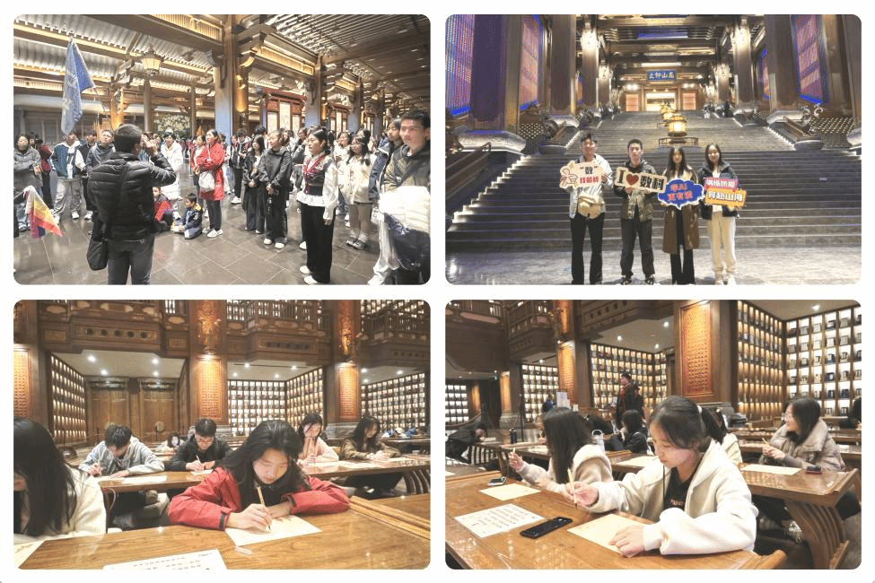 在仁厅,同学们围坐一圈,欣赏着传统文化与科技相结合的灯光秀,齐声诵读《论语》中的经典语句,领取毛笔和特制的字帖,认真地抄写论语。电子信息类专业的学生通常沉浸在数字世界和算法逻辑中,这次尼山探访活动为学生们开启了科技与传统文化相融合的新思路。