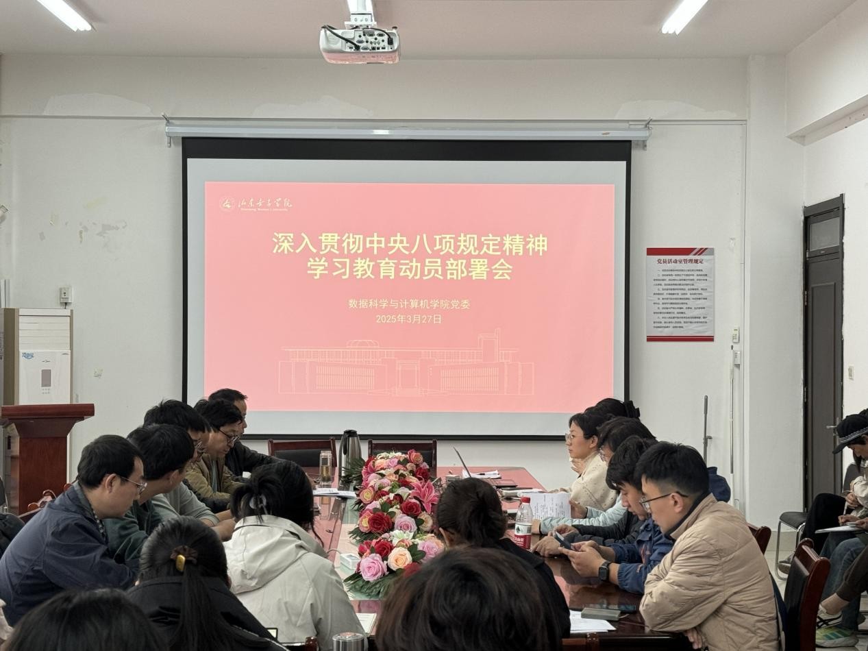 为深入学习贯彻党的二十大、二中、三中全会精神,全面落实党中央关于深化作风建设的决策部署,根据学校党委工作要求,学院党委于2025年3月27日召开深入贯彻中央八项规定精神学习教育动员部署会。学院领导班子成员、全体教职工党员及各党支部书记参加会议。党委书记张明主持会议并讲话。