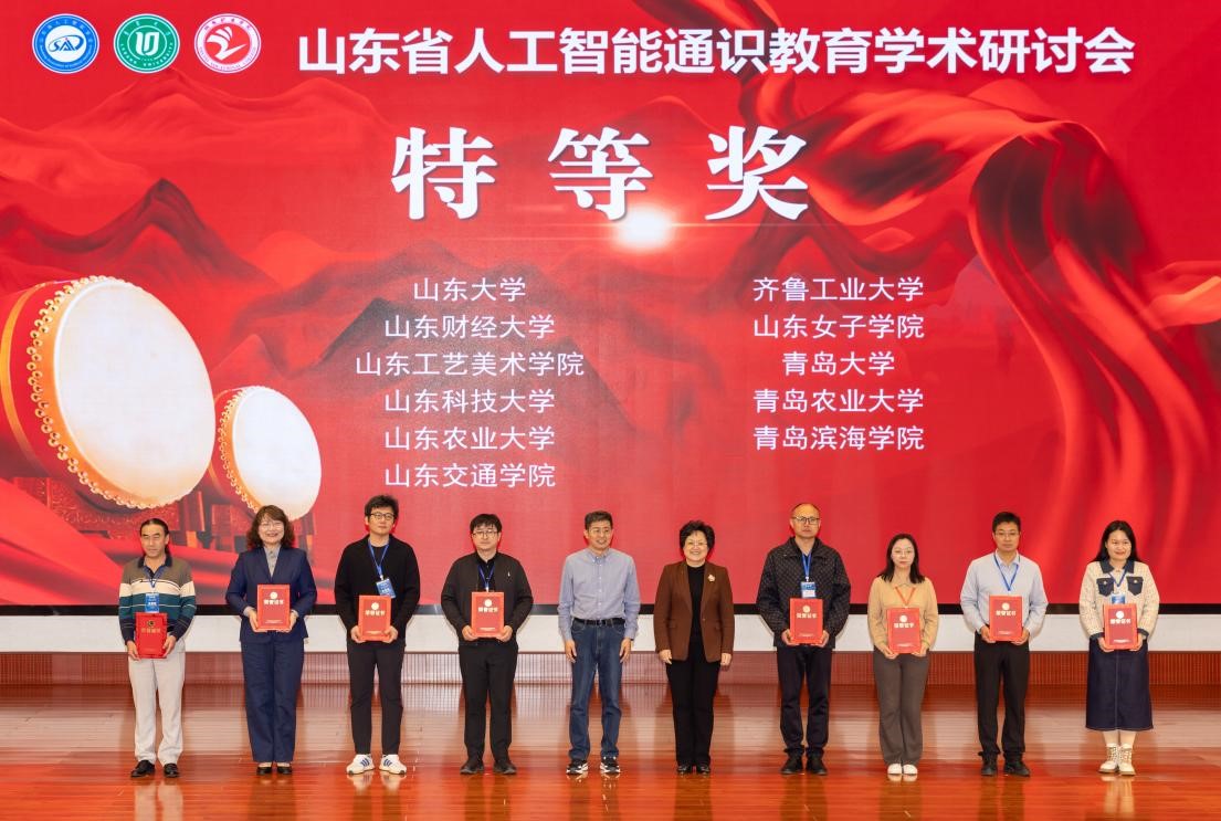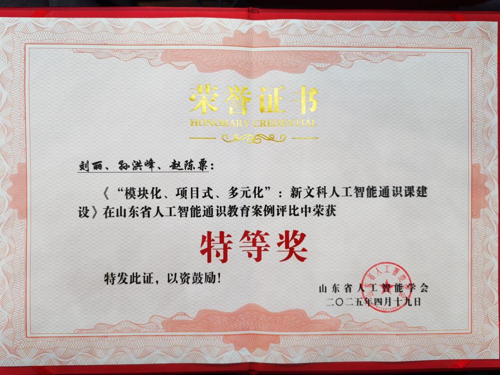本次会议进行了人工智能通识课优秀教学案例征集。由刘丽、孙洪峰、赵陈粟老师申报的《“模块化、项目式、多元化”:新文科人工智能通识课建设》在山东省人工智能通识教育案例评比中荣获特等奖。