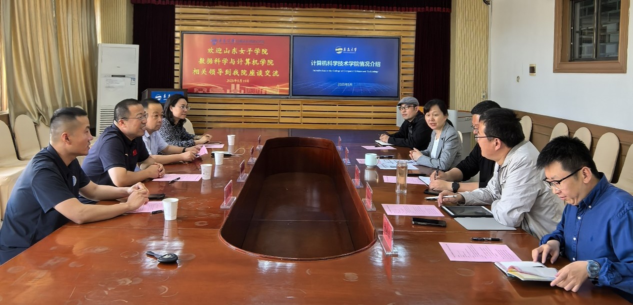 张明对计算机科学技术学院的热情接待表示感谢。孙洪峰对青岛大学计算机科学技术学院在学科建设、人才培养、科研、社会服务等方面取得的显著成就表示高度赞赏,相关经验做法非常值得借鉴学习。同时围绕数科学院近几年的发展,从专业设置、师资队伍建设、硕士点申报等方面进行了一一介绍。希望今后双方能在研究生联合培养、团队建设、教科研协同等方面开展广泛和深入的交流合作。