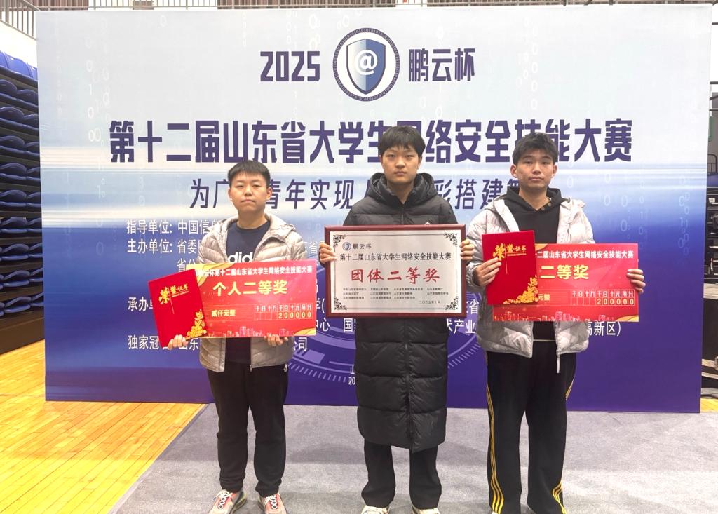 10月26日,第十二届山东省大学生网络安全技能大赛决赛在齐鲁工业大学(山东省科学院)举行。我校数据科学与计算机学院王明昊、冯嘉诚、瞿成建三位同学组成团队,由杨艳春老师带队参加了比赛。凭借扎实的专业知识和实战能力,在激烈比拼中脱颖而出,不仅荣获团体二等奖,冯嘉诚同学更斩获大学生个人二等奖,为学校赢得荣誉。