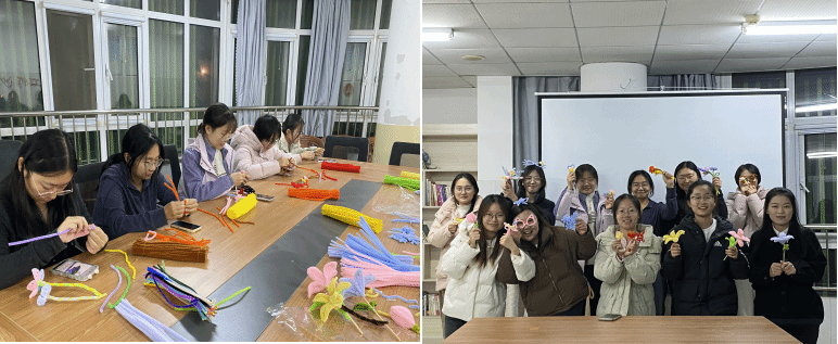 随后的扭扭棒手工实践环节,将劳动教育融入趣味体验。学院为同学们准备了彩色扭扭棒、剪刀等材料,志愿者简单讲解制作技巧后,大家迅速投入创作。指尖翻飞间,普通的扭扭棒化作花朵、小动物、挂件等创意作品,同学们相互交流技巧、分享灵感,活动室氛围热烈。此次实践不仅锻炼了动手能力,更让学子在协作中体会 “劳动创造价值” 的内涵,夯实勤劳奉献的劳动观念。