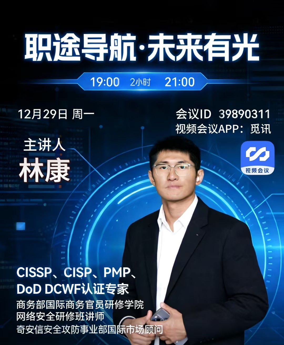 为切实助力学子明确职场发展方向,搭建与行业专家深度交流的桥梁,12月29日19:00-21:00,数据科学与计算机学院成功举办“职途导航·未来有光”线上分享会。本次分享会特邀CISSP、CISP、PMP、DoD DCWF认证专家,商务部国际商务官员研修学院网络安全研修班讲师,奇安信安全攻防事业部国际市场顾问林康主讲,全院学子踊跃参与,线上会场氛围热烈。