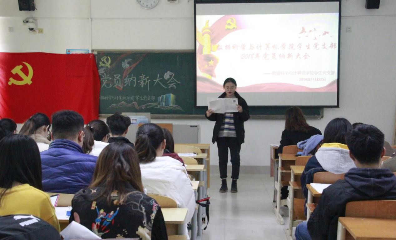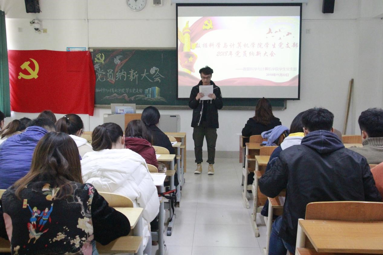 2018年11月22日数据科学与计算机学院党支部于博学楼205召开了党员纳新大会。参加此次会议的有数据科学与计算机学院党总支副书记郑全蕾书记、学生党支部全体党员以及担任入党介绍人的专业老师们,本次纳新会议由学生党支部书记魏宝懿老师主持进行。