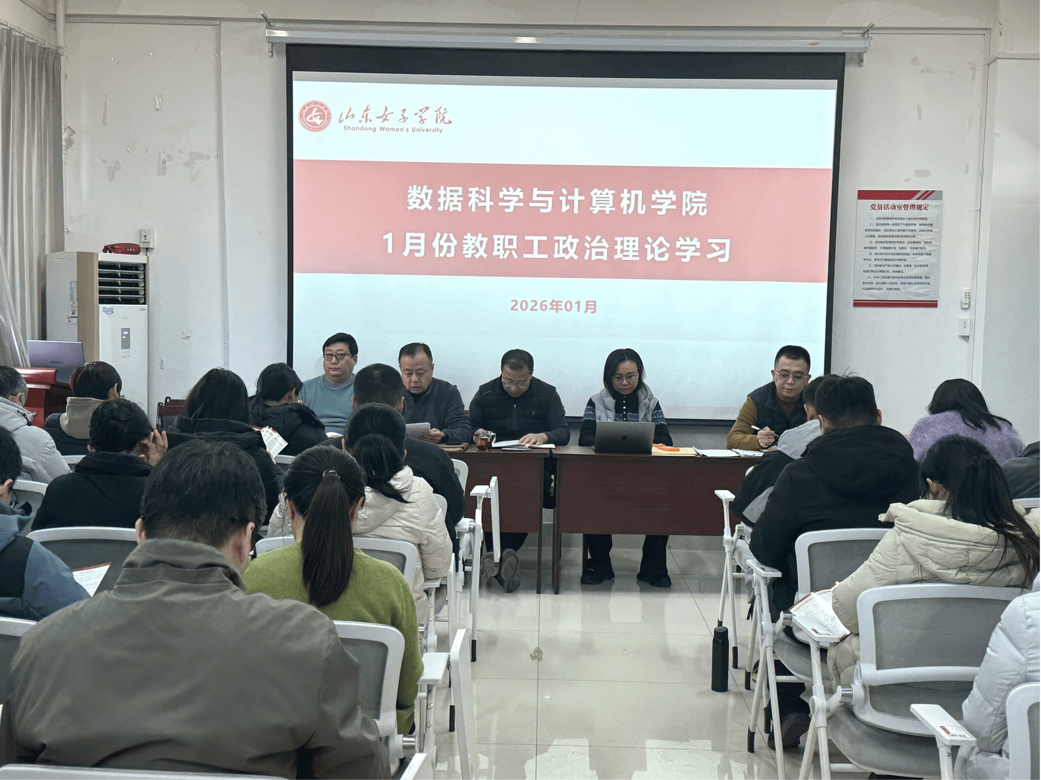 为深入学习贯彻习近平新时代中国特色社会主义思想和党的二十届四中全会精神,切实加强教职工思想政治建设,凝聚“十五五”开局之年的奋进力量,1月22日,数据科学与计算机学院党委在博雅201组织召开一月份教职工政治理论学习活动,全体教职工参加学习。