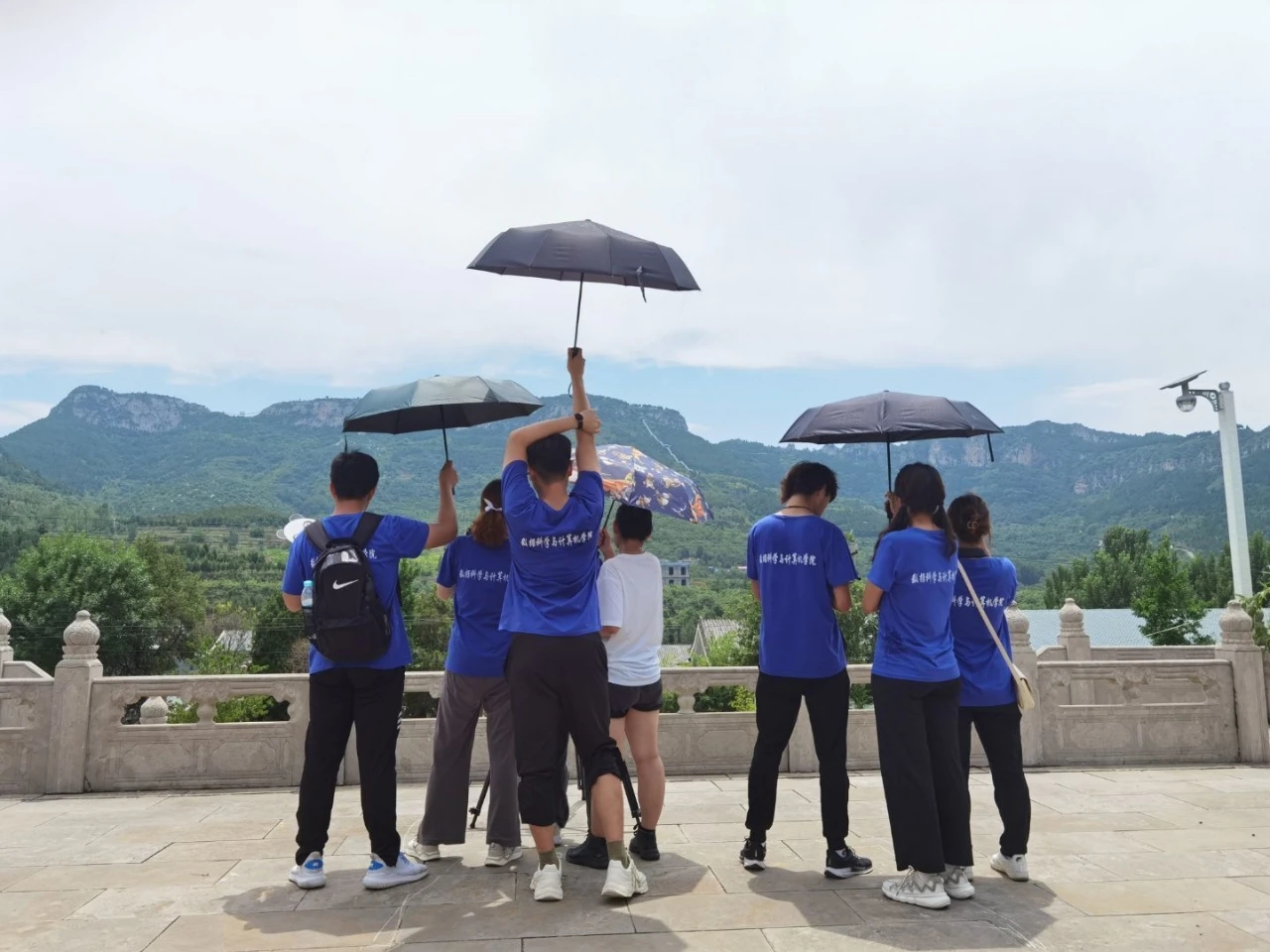 接下来,为使后续描写灵岩村旅游开发故事的叙述更加形象生动,队员们又对灵岩村的街道、檀抱泉、部分景色进行了补拍。“未见飞空天女散,落来岩际尽天花”的滴水崖下,色泽丹赤的崖壁。在景致奇特的崖壁下,在弥漫着青春气息的草地上,团队成员们舒展着灵活的身躯,舞出了青春的活力。最后,服务队一起来到了雨花源下,再次对翠绿荫蔚的大佛山进行了拍摄,同时还拍摄了剧情短视频,目的是让更多人知晓峰卓岭耸的灵岩村美景。