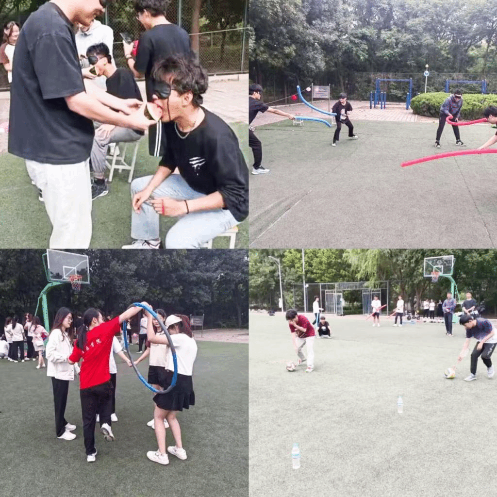 本次素质拓展活动以个人和团体参赛两种方式进行,活动设置了一系列精彩的竞赛项目。活动伊始,王倩老师组织同学们进行了破冰活动——赞美滚雪球、卡牌故事接龙,破冰活动打破了班级界线,拉近了彼此的距离。破冰活动后,同学们开展了素质拓展活动,除了蒙眼吃西瓜大赛、木棍赶球比赛等个人比赛外,还有“一圈到底”、团队滚圈跑等各种充满挑战和智慧的团体赛。在一个个团结、快乐、奋发向前的时刻,同学们展现出各自积极向上的精神风貌。与此同时,同学们团结一致、通力协作、迎难而上的顽强拼搏精神也得到了集中体现。