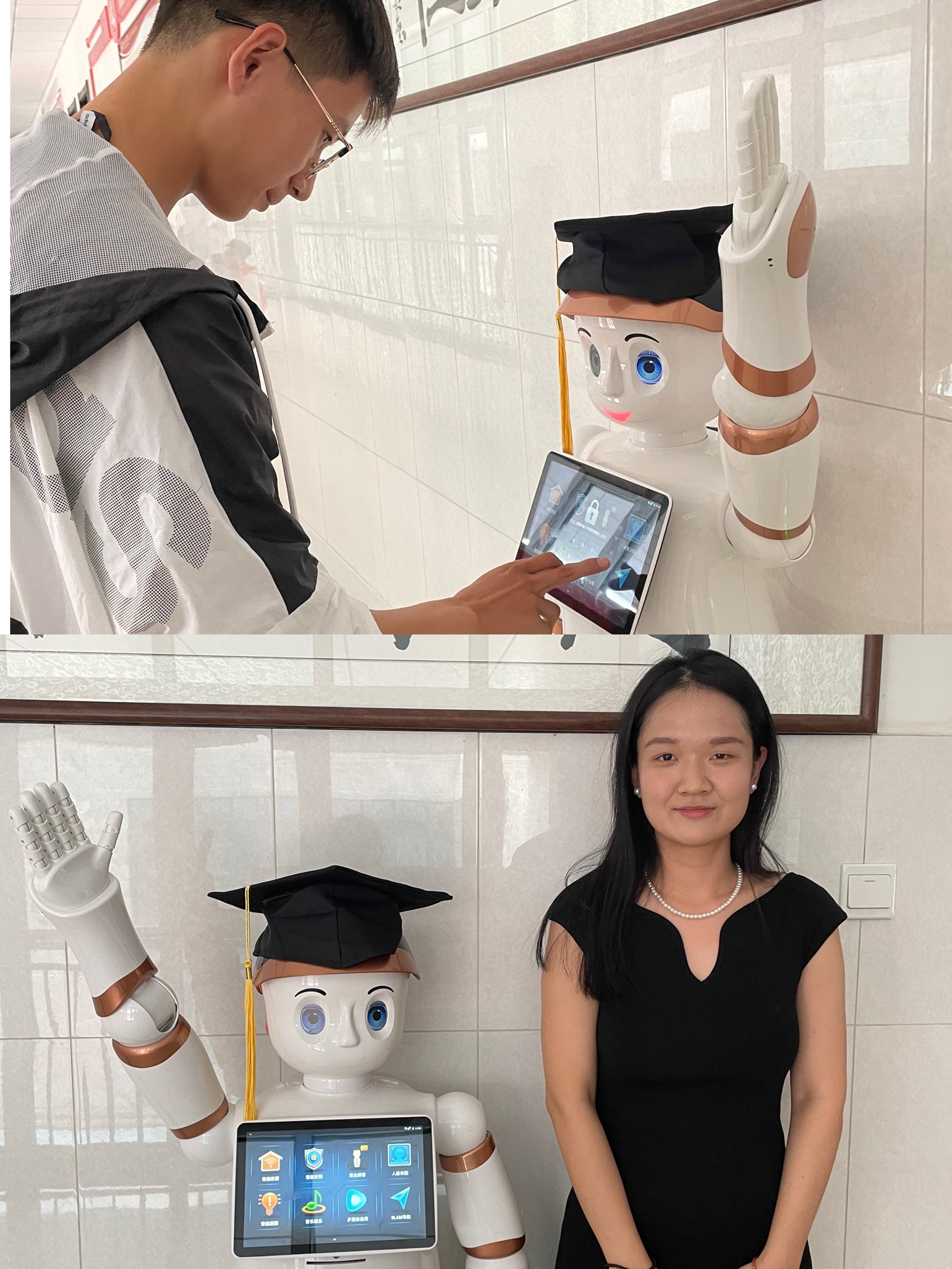 人工智能专业的同学们编写了机器人“未来天使”的程序,向毕业生们送上祝福。当毕业生们走进机器人时,未来天使会自动感应识别,用机械的声音说出“毕业快乐、前程似锦”等毕业祝福语,同时向毕业生作出挥手再见的动作,这一创意让毕业生们在临行前感受到了学院的温暖和关怀,也展现了人工智能技术的飞速发展。