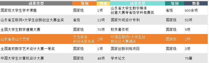 学生积极参加各类学科竞赛,获得山东文艺界最高奖-泰山文艺奖2项,在中国“互联网+”大学生创新创业大赛、全国数学建模竞赛、中国大学生计算机设计大赛等比赛中获国家级奖项120项,省部级奖项600余项。学生部分重要成果见下表。