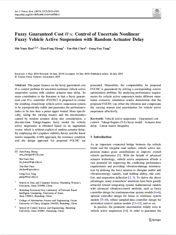 (4)FuzzyGuaranteedCostHinfinityControlofUncertainNonlinearFuzzyVehicleActiveSuspensionwithRandomActuatorDelay,InternationalJournalofFuzzySystems