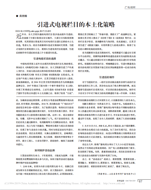 (22)新媒体背影下引进式电视栏目本土化策略研究