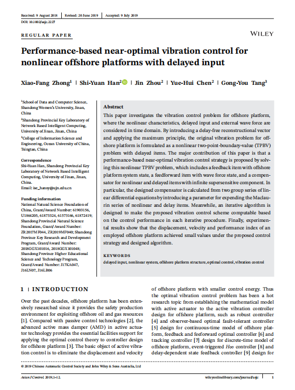 (1)Performance-basednear-optimalvibrationcontrolfornonlinearoffshoreplatformswithdelayedinput