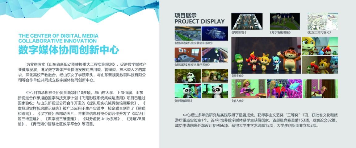 为贯彻落实《山东省新旧动能转换重大工程实施规划》,促进数字媒体产业健康发展,满足数字媒体产业快速发展对应用型、管理型、技术型人才的需求,深化高校产教融合,经山东女子学院牵头,与山东新视觉数码科技有限公司等合作单位共同成立数字媒体协同创新中心。