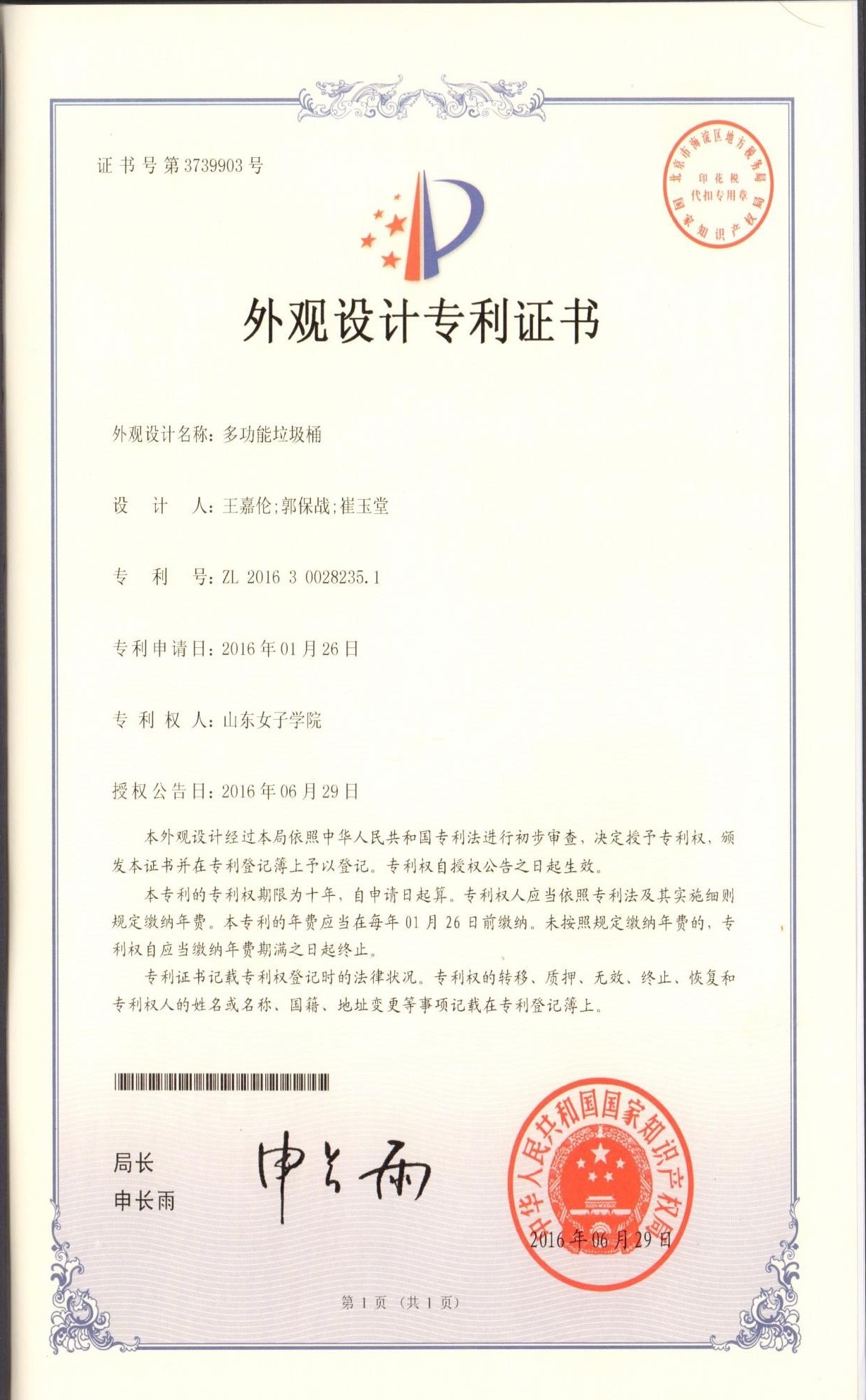 2016.06 王嘉伦 多功能垃圾桶 外观设计专利