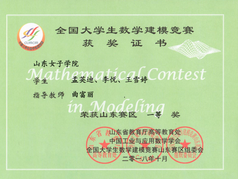 2018.10 孟英迪 “高教社杯”全国大学生数学建模竞赛 省级一等奖